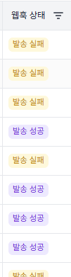 만약 웹 훅이 성공적이거나 실패하면 아래와 같은 모양으로 나오게 됩니다. 현재 결제실패 부분의 웹훅이 구현되어 있지 않아 지속적으로 발송 실패가 발생하는 것을 알 수 있습니다.