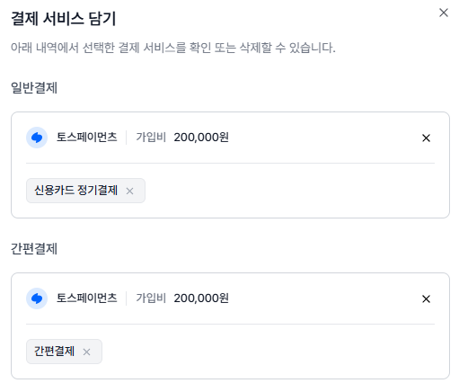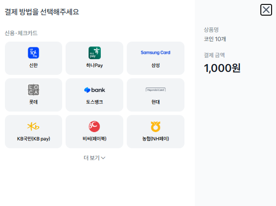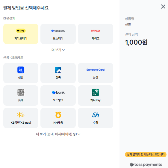 간편결제에도 기본적으로 신용*체크카드가 들어가있는 이슈가 있었습니다. 즉, 카드결제에서 신용*체크카드 결제와 간편결제에서 신용*체크카드 결제가 공통적으로 들어가는 이슈였습니다. 그리고 각각의 상점 아이디를 가지고 프론트 UI를 띄운 결과 아래 사진처럼 나왔습니다.