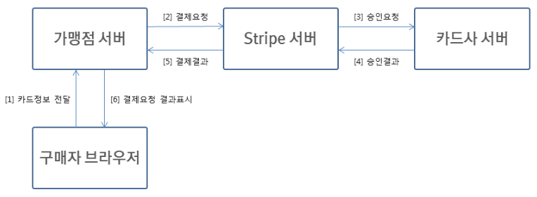 대한민국은 유저의 카드 정보를 함부로 저장할 수 없도록 법이 규정되어 있습니다. 따라서 Stripe 같은 해외 서비스의 경우에는 아래 그림처럼 유저가 카드정보를 입력하면 해당 정보들을 가맹점, Strip, 카드사 까지 단계적으로 이동을 합니다.