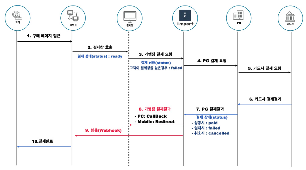 - 실제 결제 요청 : 이 정보를 기반으로 실제 결제 요청을 처리합니다. 결과로 imp_uid, transaction_id를 통해 조회 및 검증을 합니다.